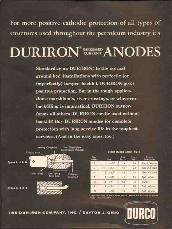 Original oil and gas trade magazine vintage ad for THE DURIRON COMPANY, INC. of Dayton, OH. For More Positive Cathodic Protection of All Types of Structures Used Throughout the Petroleum Industry It's Duriron Impressed Current Anodes. This unique 1962 old oilfield petroleum equipment industry magazine advertisement would display beautifully matted and framed.