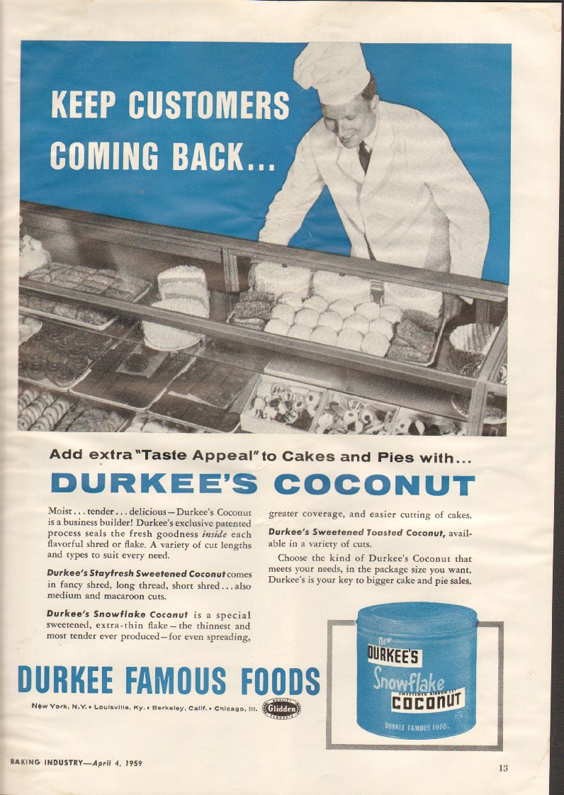 Original commercial bakery trade magazine vintage ad for DURKEE FAMOUS FOODS. Keep customers coming back with Durkee's coconut in your cakes and pies. Stayfrest Sweetened, Snowflake, and Sweetened Toasted Coconut add extra taste appeal. 1959 unique old baking industry advertisement.