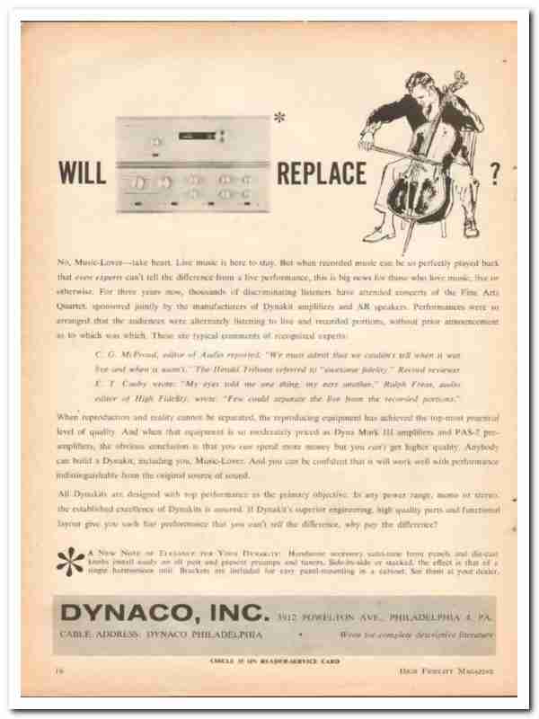 Original vintage ad for DYNACO INC. DynaKit Dyna Mark III amplifier, PAS-2pre-amp, practical level of quality. Anybody and build a Dynakit, including you, Music Lover. Kits are designed with top performance as the primary objective. See them at your local dealer.