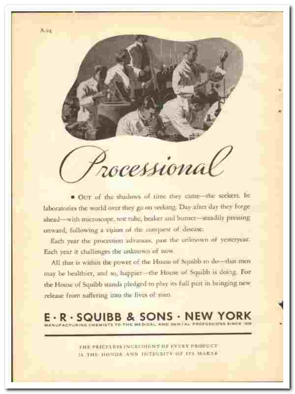 Out of the shadows of time they come; the seekers. In laboratories the world over they go on seeking. Day after day they forge ahead; with microscope, test tube, beaker and burner; steadily pressing onward, following a vision of the conquest of disease. Each year the procession advances, past the unknown of yesteryear. Each year it challenges the unknown of now. All that is within the power of the House of Squibb to do; That men may be healthier and so, happier; The House of Squibb is doing. For the House of Squibb stands pledged to play its full part in bringing new release from suffering into the lives of men.