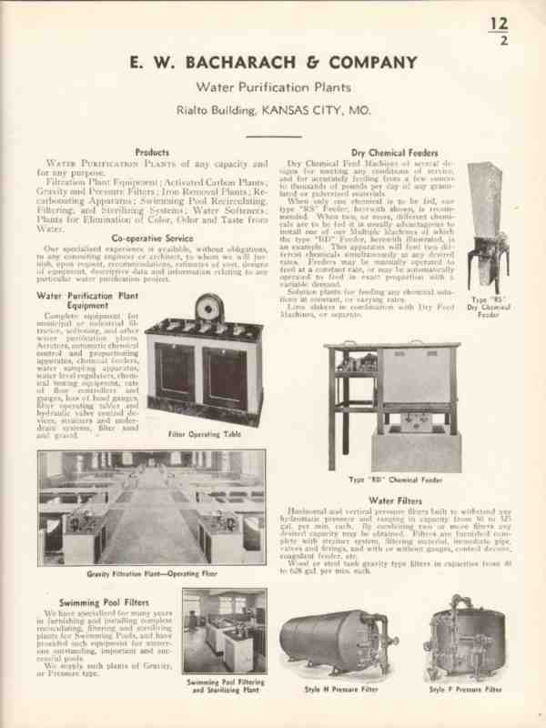 Original plumbing trade vintage catalog for E. W. BACHARACH & COMPANY. Main office and factory was located in the Rialto Building, Kansas City, MO. Manufacturers of Water Purification Plants, Gravity and Pressure Filters, Recarbonating Apparatus, Swimming Pool Recirculating, Filtering & Sterilizing Systems, Water Softeners, Plants for Elimination of Color, Odor & Taste and Dry Chemical Feeders. Unbound from a large 1936 architectural catalog, this unique old one page technical brochure would display beautifully matted and framed. A fantastic addition to your retro plumbing collection.