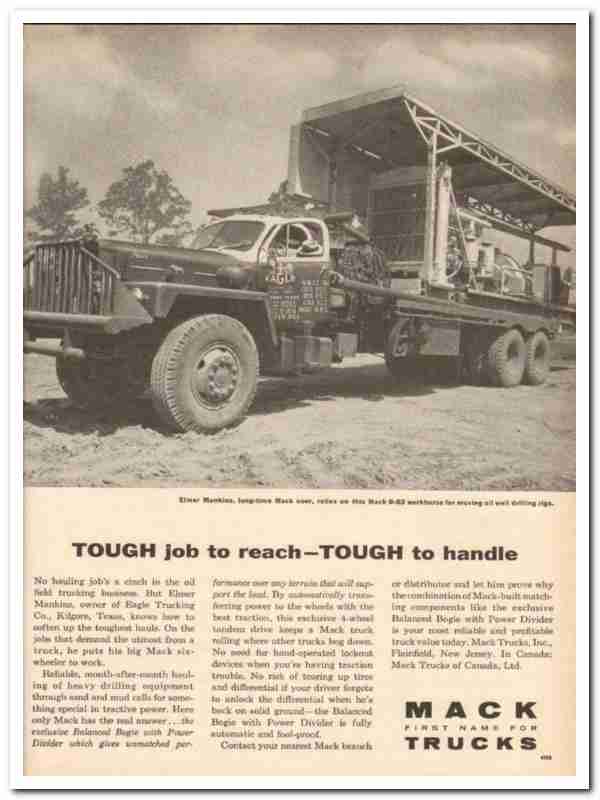 Original vintage magazine ad for EAGLE TRUCKING COMPANY. Elmer Mankins, owner, Kilgore, TX. Tough job to reach. Long time Mack user, relies on this B-83 workhorse for moving oil well drilling rigs. Mack Trucks, Inc, was located in Plainfield, NJ.