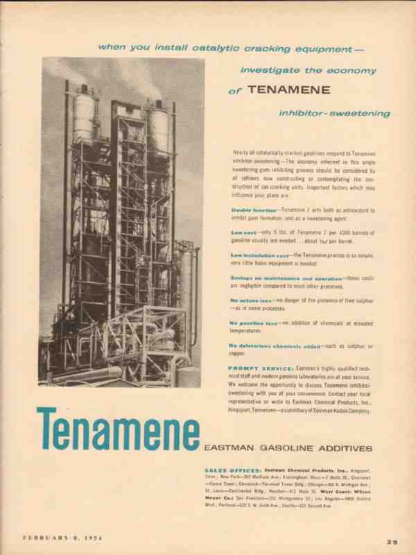 Original vintage oil and gas trade magazine ad for EASTMAN CHEMICAL PRODUCTS, INC. of Kingsport, TN. Investigate the Economy of Tenamene Inhibitor Sweetening When You Install Catalytic Cracking Equipment. Old 1954 petroleum industry oilfield and refinery advertisement.