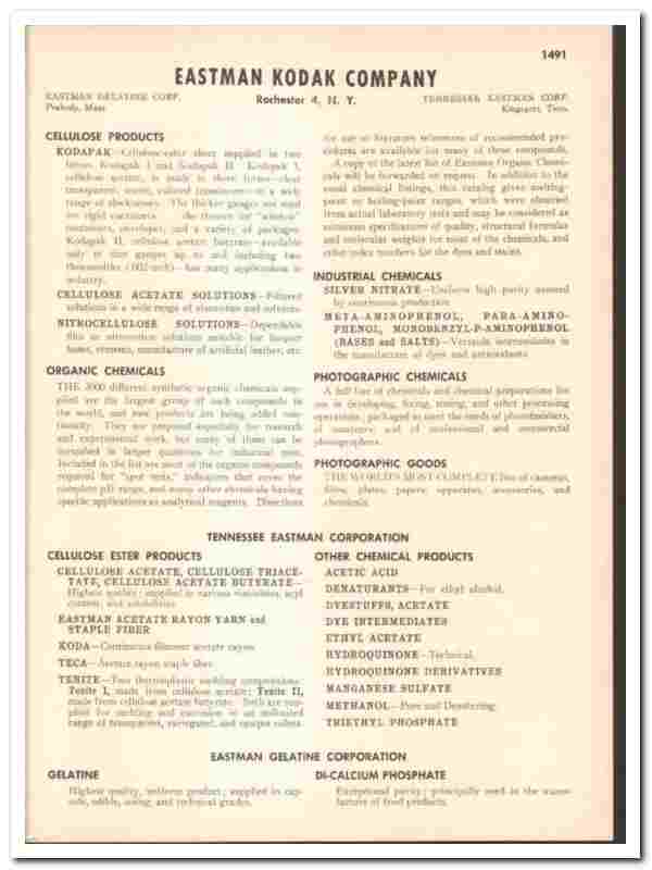 Original 1947 industrial chemical trade vintage catalog for the EASTMAN KODAK COMPANY. Main office and plant were located in Rochester, NY. (Subsidiaries were Eastman Gelatine Corp of Peabody, MA. and the Tennessee Eastman Corp, of Kingsport, TN.
