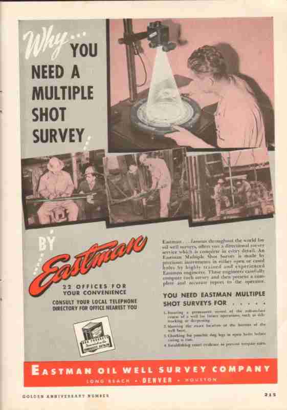 Original oil and gas trade magazine vintage ad for EASTMAN OIL WELL SURVEY COMPANY, of Denver, CO., Long Beach CA. and Houston, TX. Why You Need Multiple Shot Survey. Unique 1951 old oilfield petroleum exploration and drilling industry magazine advertisement would look sensational matted and framed.