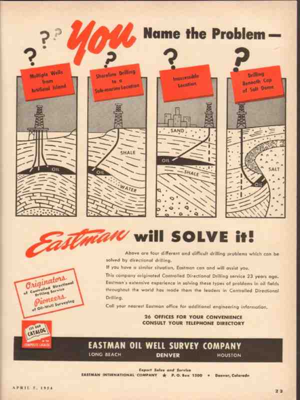 Original oil and gas trade magazine vintage ad for EASTMAN OIL WELL SURVEY COMPANY, of Denver, CO. You Name the Problem, Eastman Will Solve It! Difficult drilling problems can be solved by directional drilling. Unique 1954 old oilfield petroleum drilling industry magazine advertisement would display fantastic matted and framed. Nice graphics.