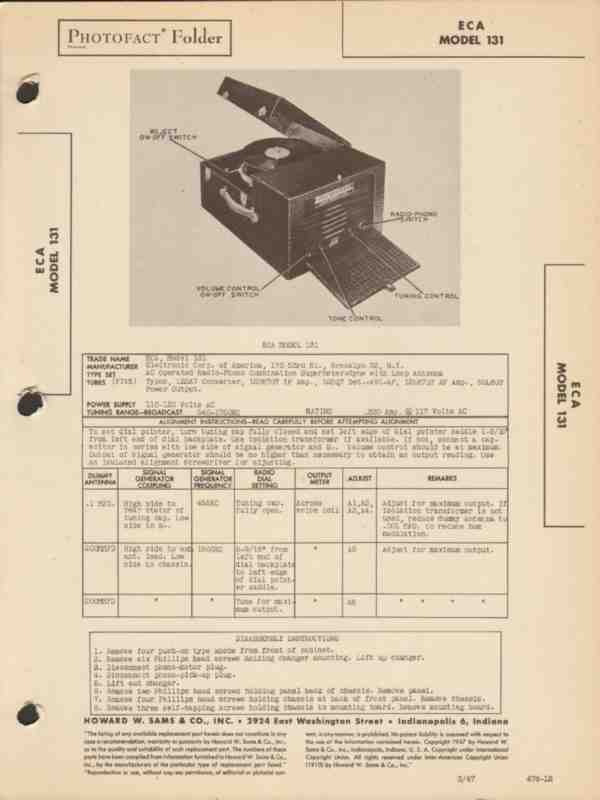 Vintage ECA model 131 combination 5 tube Superheterodyne AM radio receiver with phonograph record player. Original old Sams Photofact manual includes schematic, layout, alignment instructions, voltage & resistance test charts, repair parts list and description. 4 pages. Dated 1947. Electronic Corp. of America, of Brooklyn, NY. This manual would make a sensational accompaniment to your classic retro radio / phono equipment.