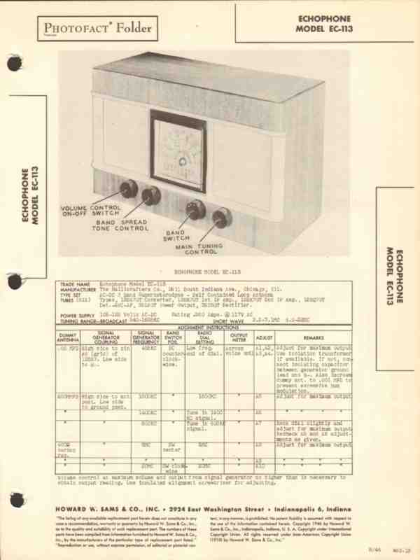 Vintage ECHOPHONE models EX-113 Superheterodyne 6 tube AM SW radio receiver. Original old Sams Photofact manual includes schematic, layout, alignment instructions, voltage & resistance test charts, repair parts list and description. Dated 1946. 4 pages. Hallicrafters Company of Chicago, IL. This manual would make a sensational accompaniment to your classic retro radio equipment.