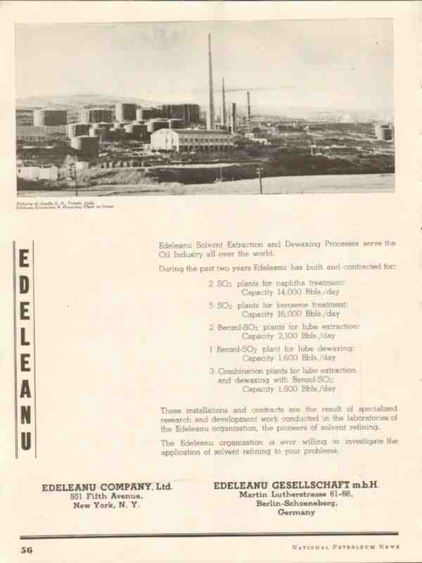 Original oil and gas trade magazine vintage ad for EDELEANU COMPANY, LTD. Was located at 561 Fifth Avenue, New York City, NY. Solvent Extraction and Dewaxing Process. Pictured is Refinery of Aquila S.A., Triesle, Italy. This unique 1937 petroleum refining process industry magazine advertisement would display beautifully matted and framed. Light crease down center of page.
