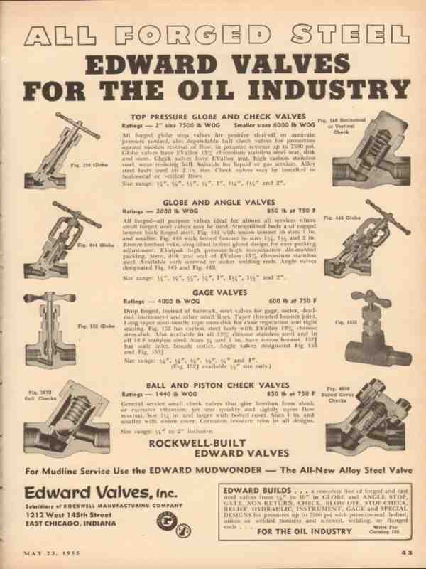 Original oil and gas trade magazine vintage ad for EDWARD VALVES, INC. Main office and factory was located at 1212 West 145th Street, East Chicago, IN. Forged Steel Globe, Check, and Angle Valve, Rockwell-Built for the Oil Industry. This unique 1955 old oilfield petroleum pipeline equipment magazine advertisement would display beautifully matted and framed.