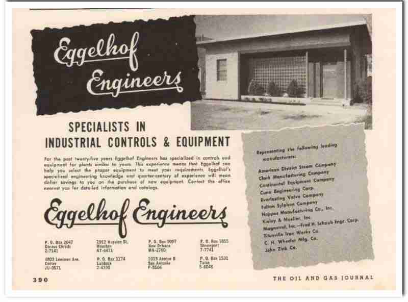 Original oil and gas trade magazine vintage ad for EGGELHOF ENGINEERS, INC. Offices were located in Houston, Corpus Christi, Dallas, Lubbuck, and San Antonio, Texas. Also in New Orleans and Shreveport, Louisiana, as well as in Tulsa, Oklahoma. Specialists in Industrial Controls & Equipment. This unique 1951 old petroleum refining and industrial control equipment magazine advertisement would display beautifully matted and framed. Approx size 6 x 8 inches.