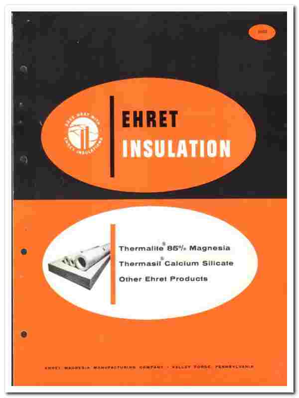 Original 1960 insulation trade vintage catalog for the EHRET MAGNESIA MANUFACTURING COMPANY. Main office and plant were located in Valley Forge, PA.