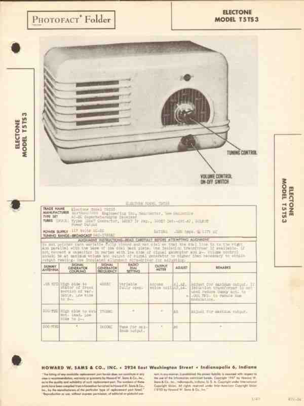 Vintage ELECTONE model T5TS3 4 tube Superheterodyne AM radio receiver. Original old Sams Photofact manual includes schematic, layout, alignment instructions, voltage & resistance test chart, repair parts list and description. 4 pages. Dated 1947. Northeastern Engineering Inc., of Manchester, NH. This manual would make a sensational accompaniment to your classic retro radio equipment.