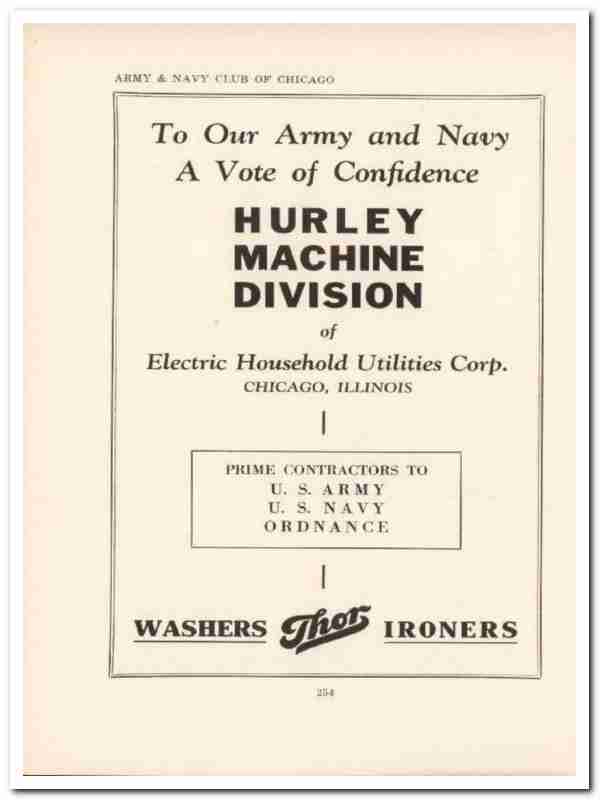 Original WW2 wartime vintage ad for ELECTRIC HOUSEHOLD UTILITIES CORPORATION, Hurley Machine Division. To our Army and Navy, a Vote of Confidence. Prime contractors to the US Army & Navy ordnance. Thor washers and ironers.