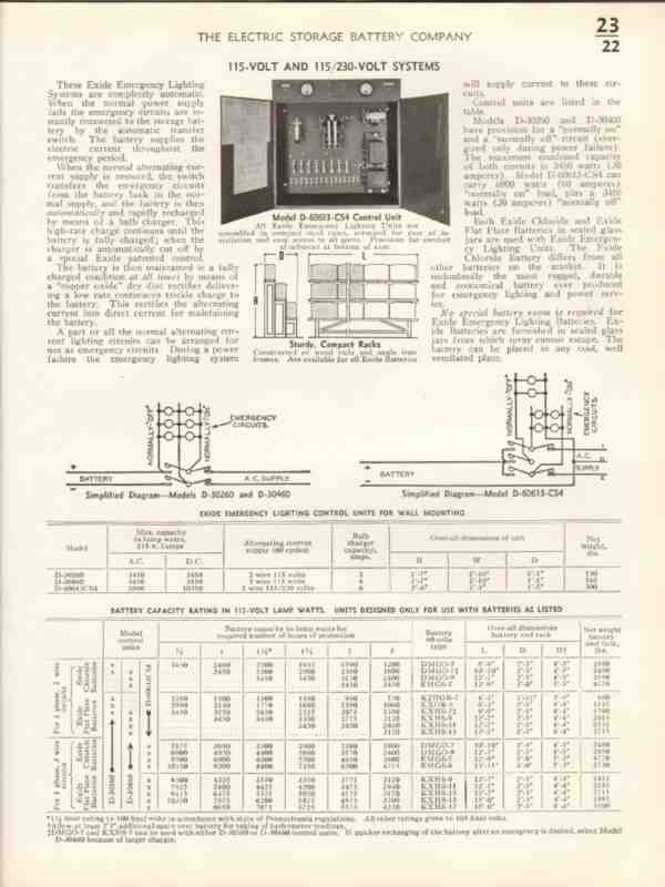Original electrical trade vintage catalog for ELECTRIC STORAGE BATTERY COMPANY, was located on Allegheny Avenue and Nineteenth Street, Philadelphia, PA. Manufacturers of Light and Power Failure equipment. Where emergency lighting is needed in many kinds of buildings. Batteries used in hospitals, schools, theaters, plants, banks, stores and engine rooms. Model B-20-12, D-40-12 Units illustrated. Disbound from a large 1938 electrical construction materials book, this unique old two page technical specifications brochure would display wonderfully matted and framed. A marvelous addition to your retro electric equipment library.