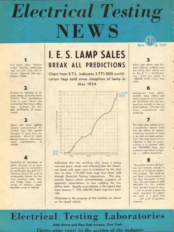Original old industry trade magazine ad for ELECTRICAL TESTING LABORATORIES of New York City, NY. Electrical Testing News. I.E.S. Lamp Sales Break All Predictions. This 1936 industry magazine advertisement would display beautifully matted and framed.