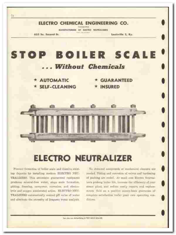 Prevent formation a boiler scale and dissolve existing deposits by installing modern Electro Neutralizers. This automatic guaranteed equipment produces mineral free water, stop scale formation, pitting, foaming, carryover, corrosion, and electrolytic and oxygen accelerated action. Electro Neutralizers automatically control pH value of water and eliminate the necessity of frequent water analysis. No chemical compounds or mechanical cleaners are needed. Pitting and corrosion of valves and hardening of packing are ended. At small cost Electro Neutralizers prolong boiler life, increase the efficiency of your steam plant, and reduce costly repairs and replacements. Was sold on a positive money-back guarantee of complete satisfaction under your own operating conditions.