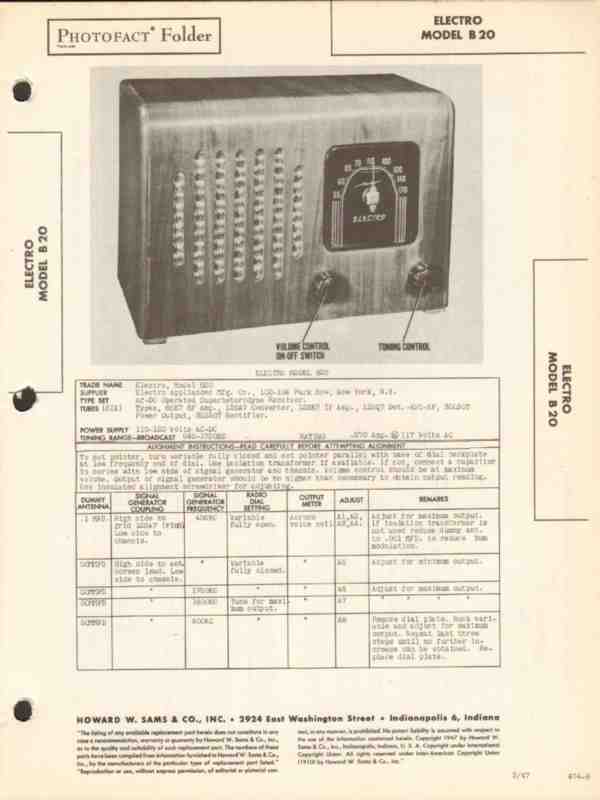Vintage ELECTRO model B20 6 tube Superheterodyne AM radio receiver. Original old Sams Photofact manual includes schematic, layout, alignment instructions, voltage & resistance test chart, repair parts list and description. 4 pages. Dated 1947. Electro Appliances Manufacturing Co. of New York, NY. This manual would make a sensational accompaniment to your classic retro radio equipment.