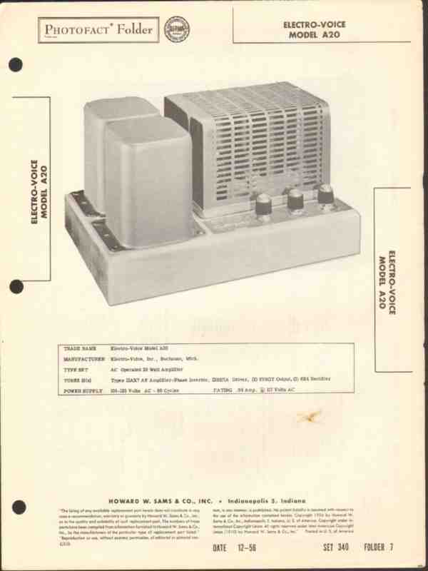 Vintage ELECTRO-VOICE model A20 20 watt audio amplifier. Original old Sams Photofact manual with schematics, layouts, voltage & resistance readings, and parts list. 4 pages. Dated 1956. Six tubes. Electro Voice, Inc. of Buchanan, MI. This would make a sensational accompaniment to your vintage audio equipment.