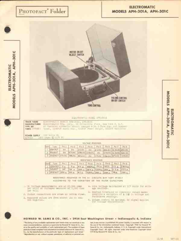 electromatic model aph-301a aph-301c phonograph sams photofact manual
