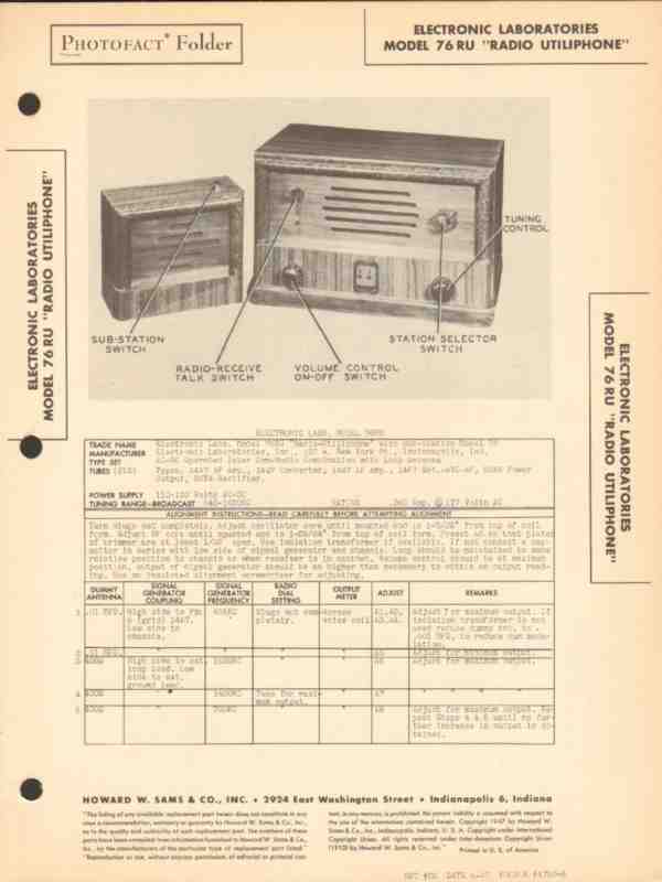 Vintage ELECTRONIC LABS model 76RU (Radio Utiliphone) AM radio receiver with intercom. Original old Sams Photofact manual includes schematic, layout, alignment instructions, voltage & resistance test charts, repair parts list and description. 4 pages. Dated 1947. Electronic Laboratories, Inc., of Indianapolis, IN. This manual would make a sensational accompaniment to your classic retro radio equipment.