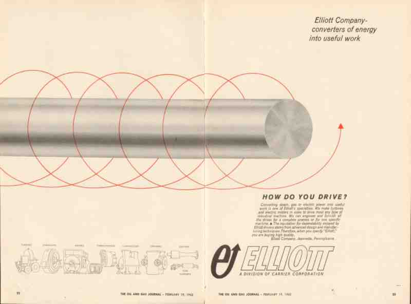 Original oil and gas trade magazine vintage ad for ELLIOTT COMPANY of Jeannette, PA. Converters of energy into useful work. Turbines and electric motors in sizes to drive most any type of industrial machine. Turbines, generators, motors, turbochargers, compressors, strainers, and ejectors. Division of Carrier Corporation. This unique 1962 old petroleum refining process industry magazine advertisement would display beautifully matted and framed. Two page gatefold advertisement.