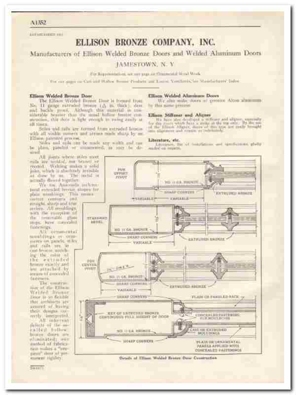 Original door trade vintage catalog for ELLISON BRONZE COMPANY, INC. Main office was located in Jamestown, NY. Manufacturers of welded aluminum doors and Ellison bronze doors. Details of door construction is provided. This unique 1931 old one page building materials brochure would display beautifully matted and framed. A marvelous addition to your retro architectural design and engineering library.