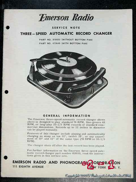 Original vintage Service Note for EMERSON RADIO 3 SPEED AUTOMATIC RECORD CHANGER, Howard Sams Photofact Exploded View. Has specifications, operation,cycles, lubrication, troubleshooting charts, parts list. The manual has holes at the left margin to place it in a 3 ring binder. It is in VG condition, with the pages clean and intact. 20 pages. Dated 1950.