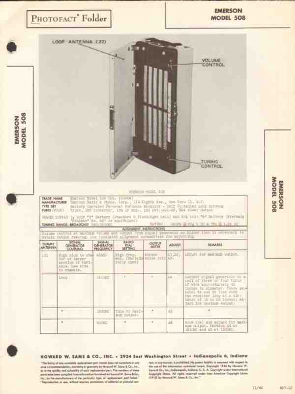 Vintage EMERSON model 508 (Chassis 120008) Superheterodyne 4 tube portable AM radio receiver. Original old Sams Photofact manual includes schematic, layout, alignment instructions, voltage & resistance test charts, repair parts list and description. Dated 1946. 4 pages. Emerson Radio and Phonograph Corp., of New York, NY. This manual would make a sensational accompaniment to your classic retro radio equipment.