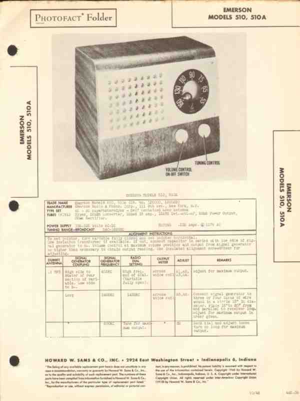 Vintage EMERSON models 510 and 510A (Chassis 120000 and 120029) Superheterodyne 5 tube AM radio receiver. Original old Sams Photofact manual includes schematic, layout, alignment instructions, voltage & resistance test charts, repair parts list and description. Dated 1946. Emerson Radio and Phonograph Corp., of New York, NY. This manual would make a sensational accompaniment to your classic retro radio equipment. 2 pages.