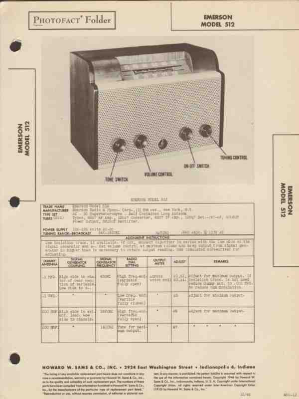 emerson model 512 6 tube am radio receiver sams photofact manual