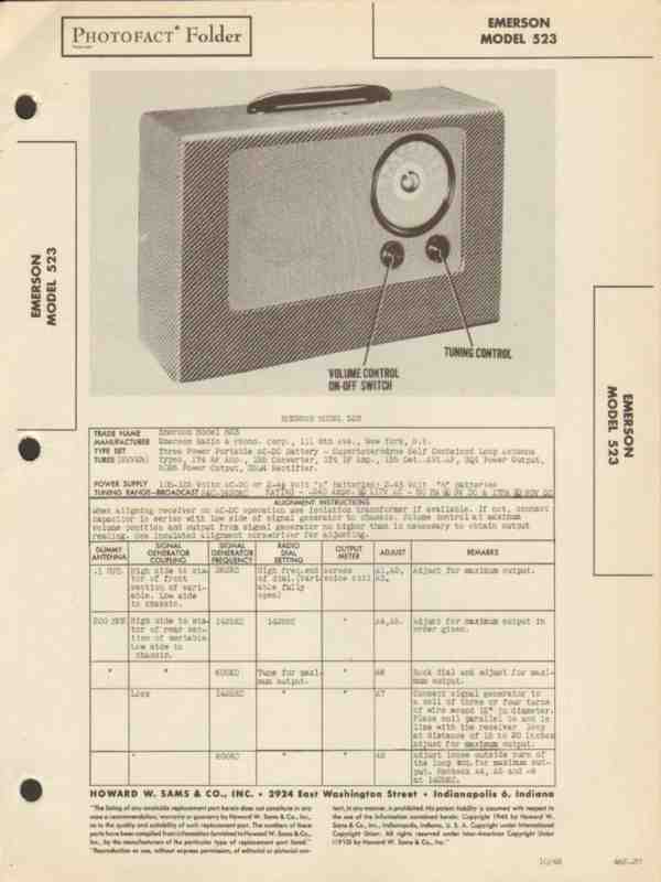 emerson model 523 7 tube am radio receiver sams photofact manual