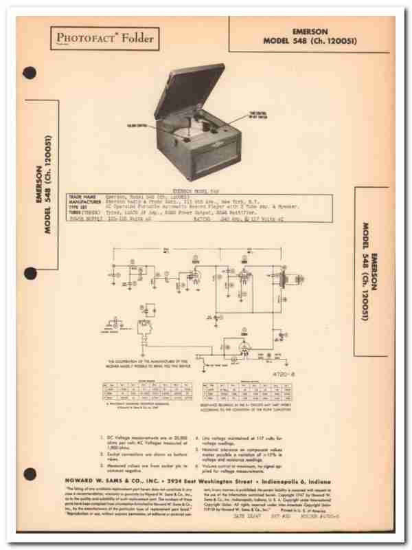 Vintage Radio Service Manual - EMERSON model 548 (Chassis No. 120051) 3-tube record player phonograph. Manufactured by Emerson Radio and Phonograph Corp., of New York, NY. Dated 1947. 2 pages. Original old Sams Photofact manual includes schematic, layout, voltage & resistance test chart, repair parts list and description. This manual would make a sensational accompaniment to your retro phono equipment.