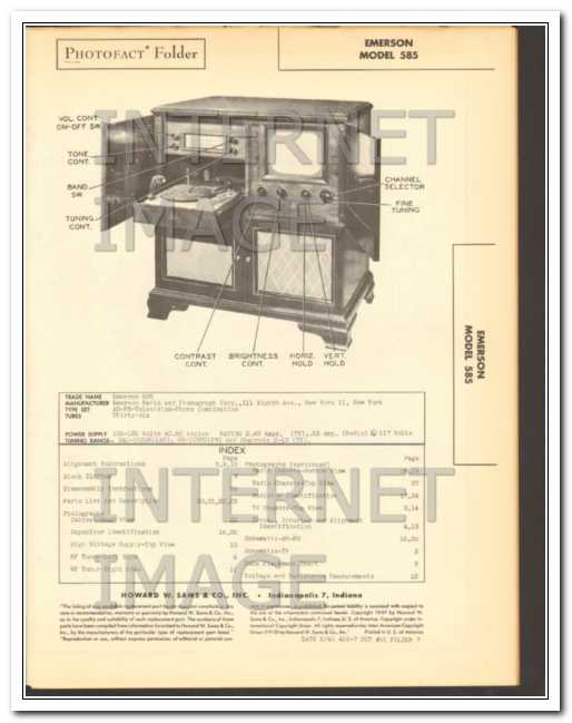 Vintage EMERSON model 585 36 tube television, TV, AM, FM radio receiver with phonograph record player. Original old Sams Photofact manual includes schematic, layouts, alignment info, adjustments, voltage & resistance charts, repair parts list. 28 pages. Dated 1949. Emerson Radio and Phonograph Corp., of New York, NY. This manual would make a sensational accompaniment to your vintage audio equipment.