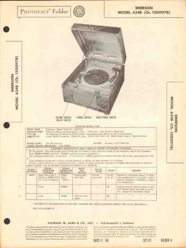 Vintage EMERSON model 634B (Ch. 120097B) 5 tube Superheterodyne AM radio receiver with phonograph record player. Original old Sams Photofact manual includes schematic, layouts, alignment info, repair parts list. 4 pages. Dated 1950. Emerson Radio and Phonograph Corp., of New York, NY.