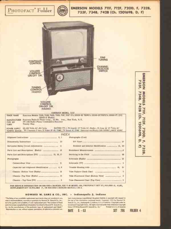 Vintage EMERSON models 711F, 712F, 720D, 720F, 732B, 733F, 734B and 742B (Ch. 120169B, 120169D and 120169F) combination 29 tube TV television, AM radio receiver with phonograph record player. Original old Sams Photofact manual includes schematic, layout, alignment instructions, voltage & resistance test chart, repair parts list. 23 pages. Dated 1953. This manual would make a sensational accompaniment to your classic radio, video TV equipment collection.