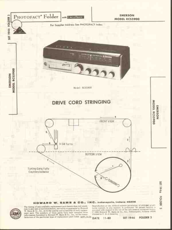 Vintage EMERSON model RCS5900 AM FM Stereo tape clock radio. Original old Sams Photofact manual includes schematics, layouts, alignment, adjustments, parts list. 31 pages. Dated 1980.