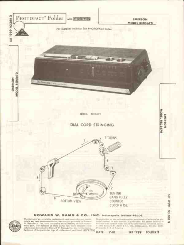 Vintage EMERSON model RED5670 AM FM clock radio. Original old Sams Photofact manual includes schematics, layouts, alignment, adjustments, parts list. 12 pages. Dated 1981.