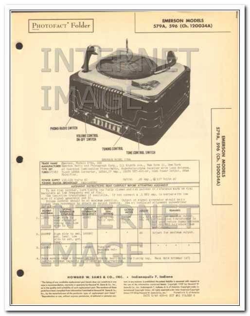 Vintage EMERSON models 579A and 596 (Ch. 120034A) 5 tube Superheterodyne AM radio receiver with phonograph record player. Original old Sams Photofact manual includes schematic, layouts, alignment info, repair parts list. 4 pages. Dated 1949. Emerson Radio and Phonograph Corp., of New York, NY. This manual would make a sensational accompaniment to your vintage audio equipment.