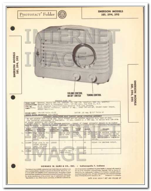 Vintage EMERSON models 581, 594 and 595 5 tube Superheterodyne AM radio receiver. Original old Sams Photofact manual includes schematic, layouts, alignment info, repair parts list. 4 pages. Dated 1949. Emerson Radio and Phonograph Corp., of New York, NY.