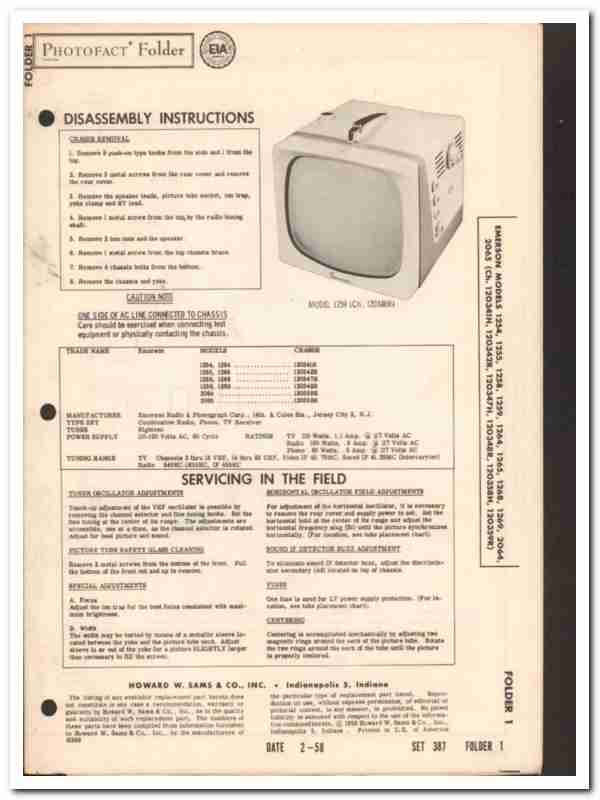 Vintage EMERSON models 1254, 1255, 1258, 1259, 1264, 1265, 1268, 1269, 2064 and 2065.(Chassis 120341H, 120342R, 120347H, 120348R, 120358H and 120359R). Original old Sams Photofact manual includes schematics, parts layout, alignment instructions, tube failure check chart, voltage & resistance measurement test chart, repair parts list and description. 16 pages. Dated 2-1958. Manufactured by Emerson Radio and Phonograph Corp., of Jersey City, NJ. This manual would make a sensational accompaniment to your retro television equipment.