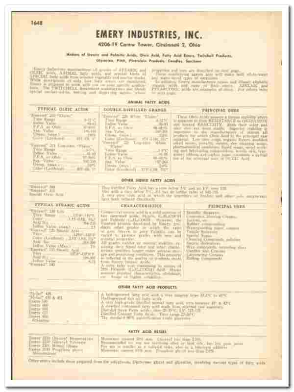 Emery Industries manufacturers all grades of Stearic and Oleic acids, Animal fatty acids and several kinds of Special fatty acids from selected vegetable and marine stocks. While descriptions of only four fatty esters are mentioned, Emery is prepared to work with you on your specific applications. The Twitchell Department manufacturers and blends special surface-active, wetting and dispersing agents, whose properties and uses are described, these emulsifying agents also will make both oil-in-water and water-in-oil types of emulsions. In addition, Emery manufacturers mono- and the dibasic aliphatic organic acids and some of their esters, Azelaic and Pelargonic Acids are examples of these.