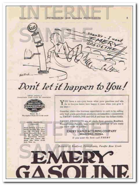Original vintage oil and gas magazine ad, EMERY MANUFACTURING COMPANY of Bradford, PA. Don't Let It Happen TO You! Emery Gasoline . Art by Rob Beebe. Old 1924 petroleum industry gas station advertisement.