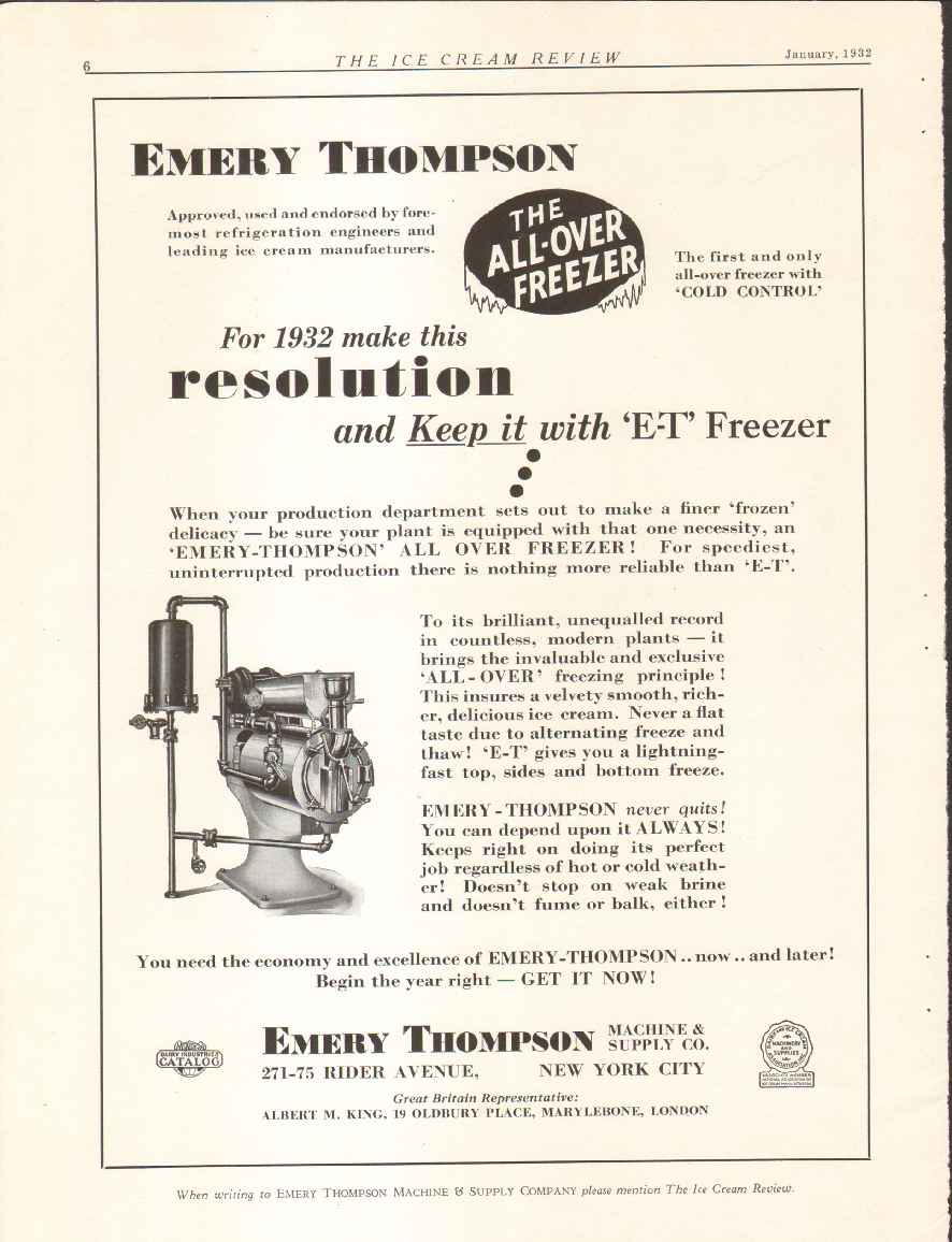 Original 1932 ice cream vintage magazine ad for the EMERY THOMPSON MACHINE & SUPPLY COMPANY. Main office and plant were located at 271-275 Rider Street, Bronx, NY.