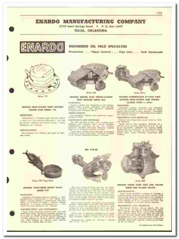 Original 1957 Oil and Gas trade vintage catalog for the ENARDO MANUFACTURING COMPANY. Main office and plant were located at 2729 Sand Springs Road, Tulsa, OK.