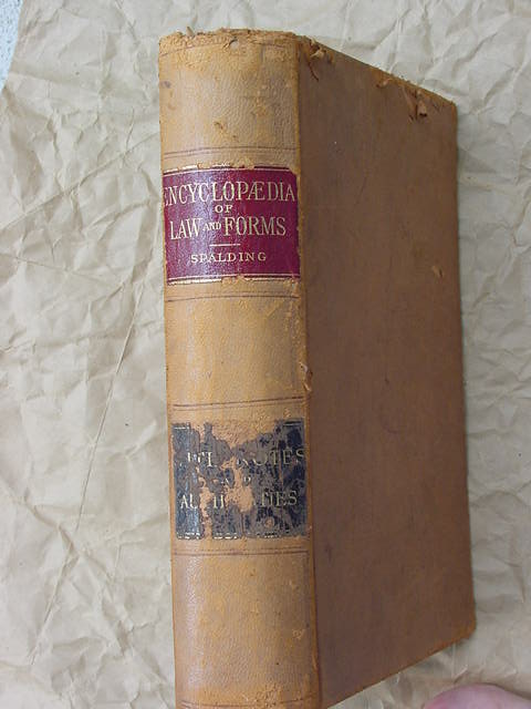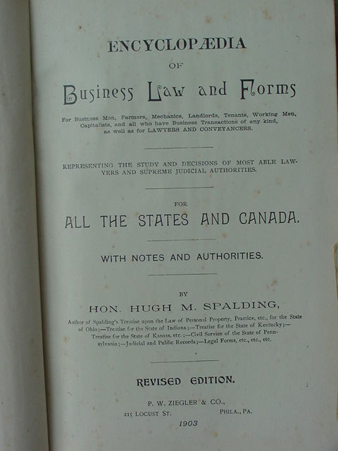 Hard covered book titled ENCYCLOPEDIA OF BUSINESS LAW AND FORMS by Hon. Hugh M Spalding. Revised edition, in VG condition, was printed in 1903. 702 pages.
