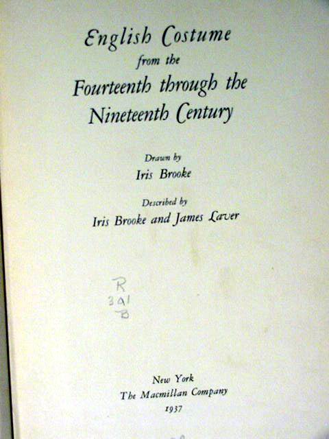 Vintage used hard covered book titled, ENGLISH COSTUME FROM THE FOURTEENTH THROUGH THE NINETEENTH CENTURY. Drawn by Iris Brooke, Described by Iris Brooke and James Laver, 1937. 426 pages.