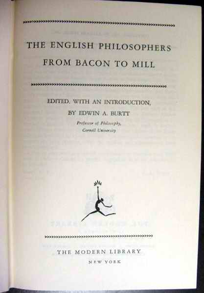 Hard covered book titled THE ENGLISH PHILOSOPHERS FROM BACON TO MILL, Edited, with an Introduction, by Edwin Burtt, 1939, 1,041 pages.
