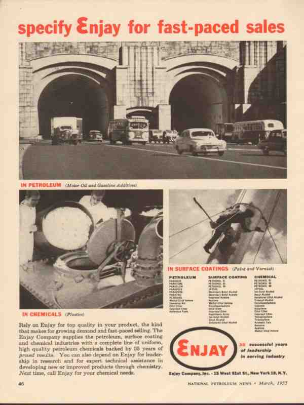 Original oil and gas service station industry trade magazine vintage ad for ENJAY COMPANY, I NC. of New York City, NY. Specify Enjay for Fast Paced Sales in Petroleum, Chemicals, Surface Coatings. Motor oil and gasoline additives, plastics, paint and varnish. Old 1955 gasoline service station magazine advertisement.