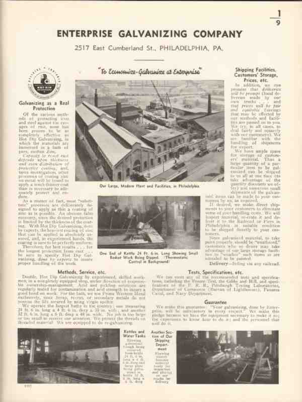 Original metal trade vintage catalog for ENTERPRISE GALVANIZING COMPANY. Main office and factory was located at 2517 East Cumberland Street, Philadelphia, PA. Hot Dip Galvanizing, where the materials are immersed in a bath of pure, molten zinc. Protect iron and steel against the ravages of rust. Unbound from a large 1936 engineering catalog, this unique old one page technical brochure would display beautifully matted and framed. A fantastic addition to your retro metal library.
